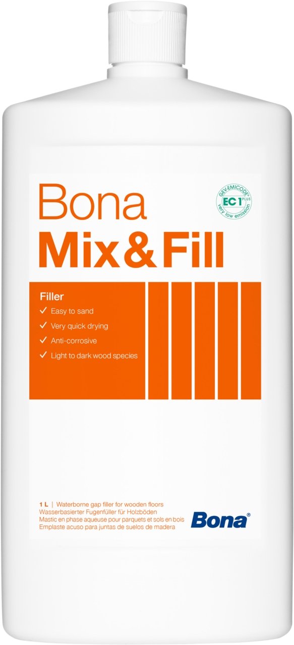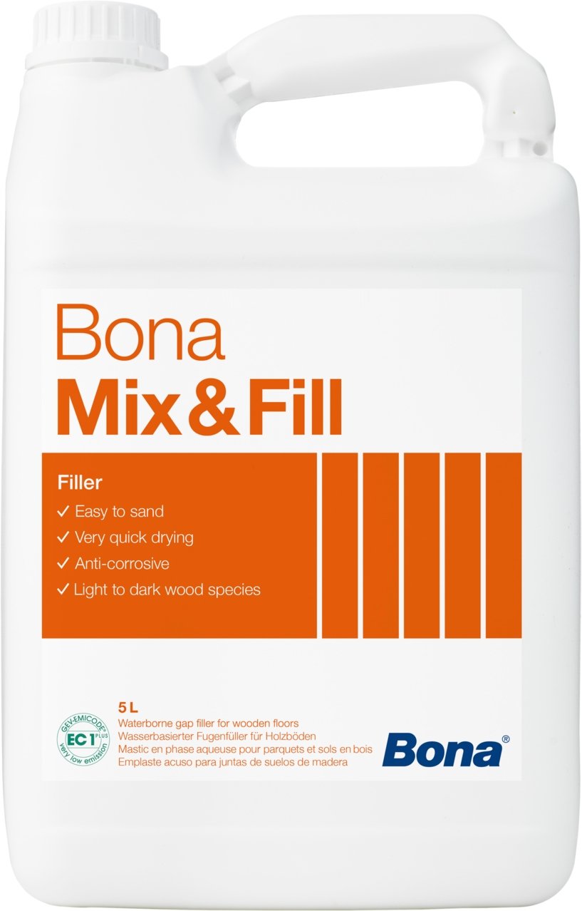 Bona Mix & Fill joint filler available in 1L & 5 L. Designed for mixing to a suitable consistency with fine sanding dust from the timber floor that is being treated. Bona Mix & Fill can be used to fill narrow joints up to 2mm wide and other small defects in the wood.