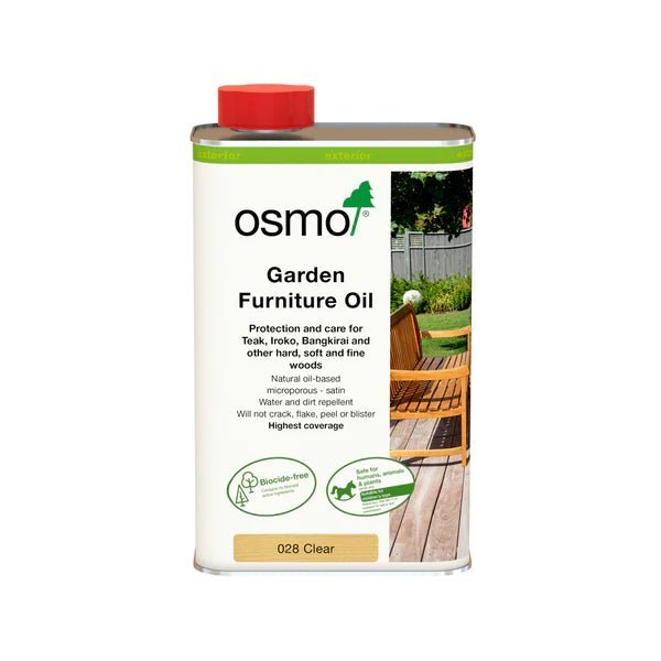 Wood species with a high content of natural wood extractives need to weather off (min. 4 weeks) before the initial treatment or be cleaned with Osmo Brush Cleaner and Thinner (degreaser). Resinous wood, such as Larch or Douglas Fir, needs to weather off for at least 6 weeks. Pressure-impregnated wood, Massaranduba,Bangkirai or Garapa need to weather off for at least 3 months. De-grey any already greyed wood with Osmo Wood Reviver Power-Gel before applying Osmo Garden Furniture Oil. Wood surface must be clean, dry and frost-free (moisture content max. 20%). Osmo Garden Furniture Oil is ready to use. Do not thin. Stir well before use. Thoroughly clean or lightly sand old microporous stains or completely remove old varnishes before application. Always wear a dust mask while sanding. If possible, please apply the first coat to all sides before installation. If additional protection against blue stain, rot and insect attack is desired, pre-treat the wood, if possible on all sides, with Osmo WR Impregnation.