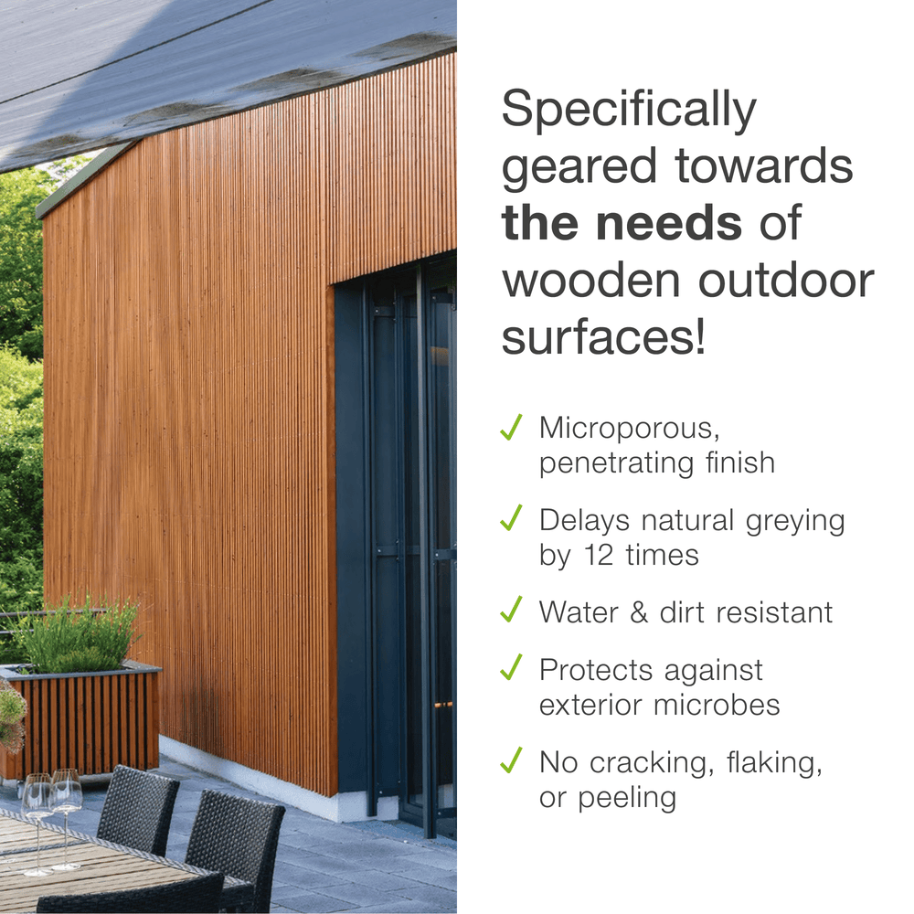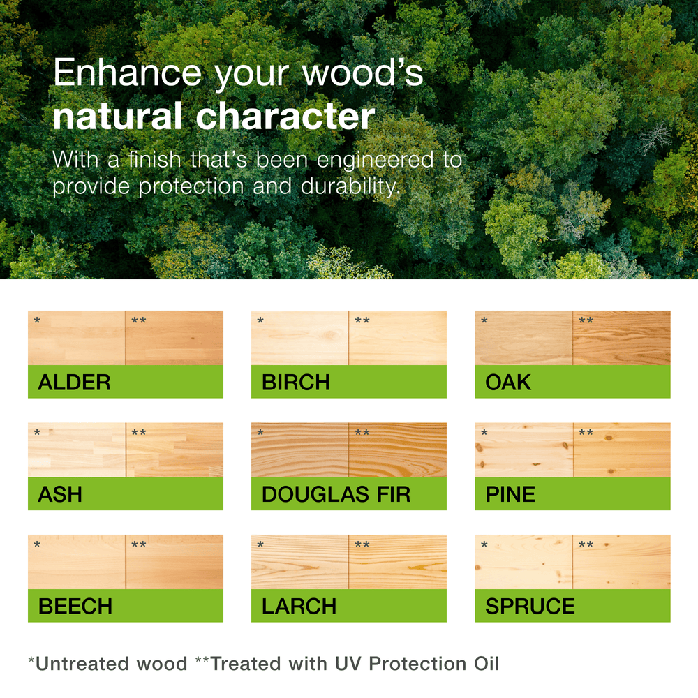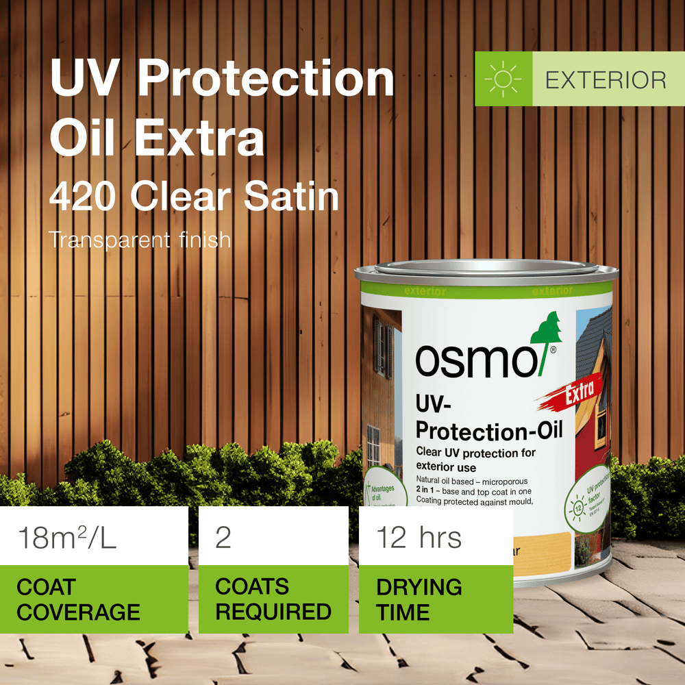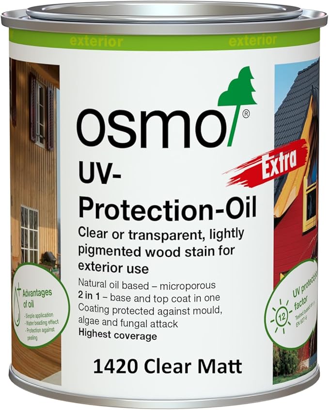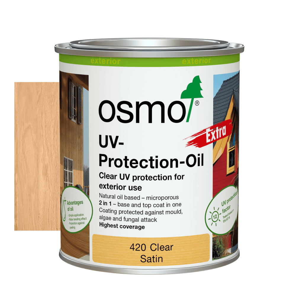 Osmo UV-Protection-Oil Extra is a satin, clear finish for exterior. It is based on natural oils, is microporous, and does not crack, flake, peel or blister. When used as a final finish after staining wood, Osmo UV-Protection-Oil Extra prolongs the renovation time significantly. As a stand alone finish, with two coats, it prolongs the greying process on vertical surfaces by UV-Protection factor 12 in comparison to untreated wood. The finish contains active ingredients which protect it from mould, algae and fungal attack. Easy to renew, no sanding or primer necessary. Easy to apply, will not dry during application.