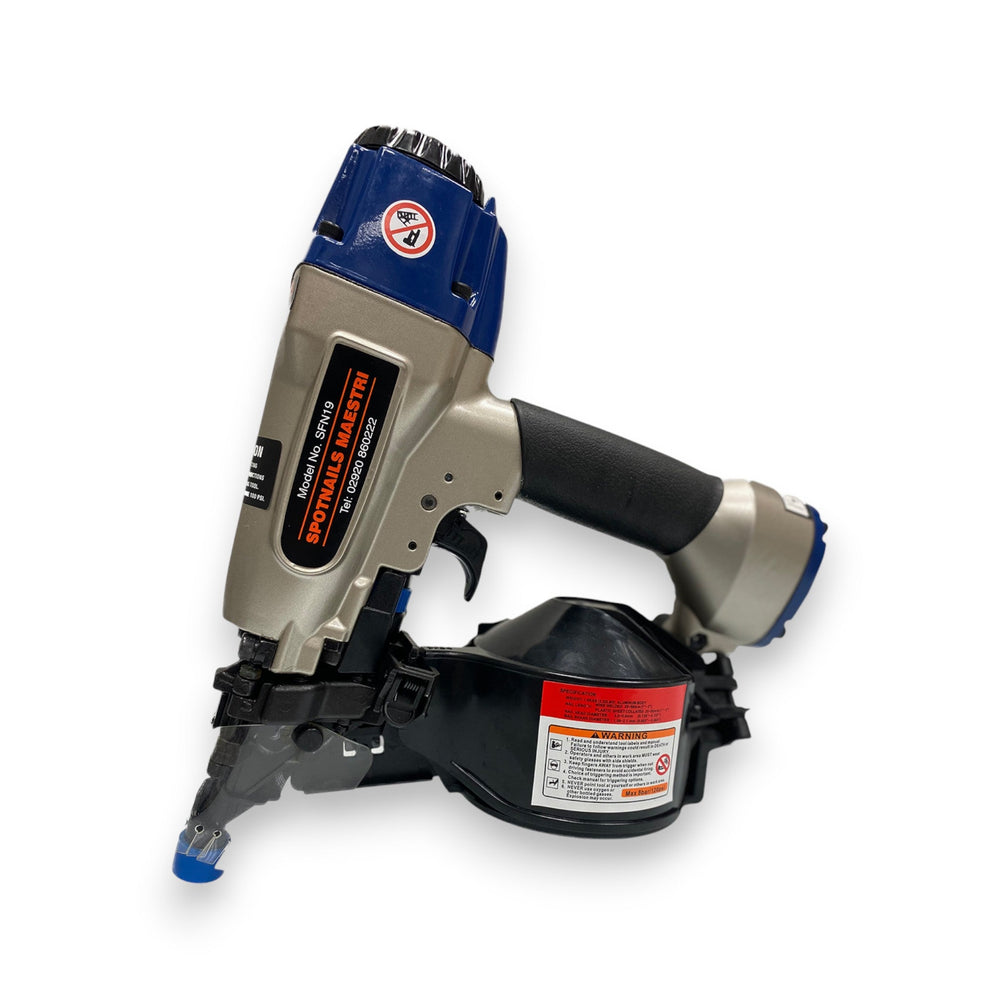 Spotnails SFN19 Coil Nailer is a unique Spotnails own branded pneumatic tool designed for fixing plywood, and hardboard to the timber sub floor prior to installation of floor coverings. Complete with a bump fire tip, depth adjustment control and a built in sound reducer. Uses plastic sheet collated nails from 19mm, 22mm, 25mm & 28mm sizes